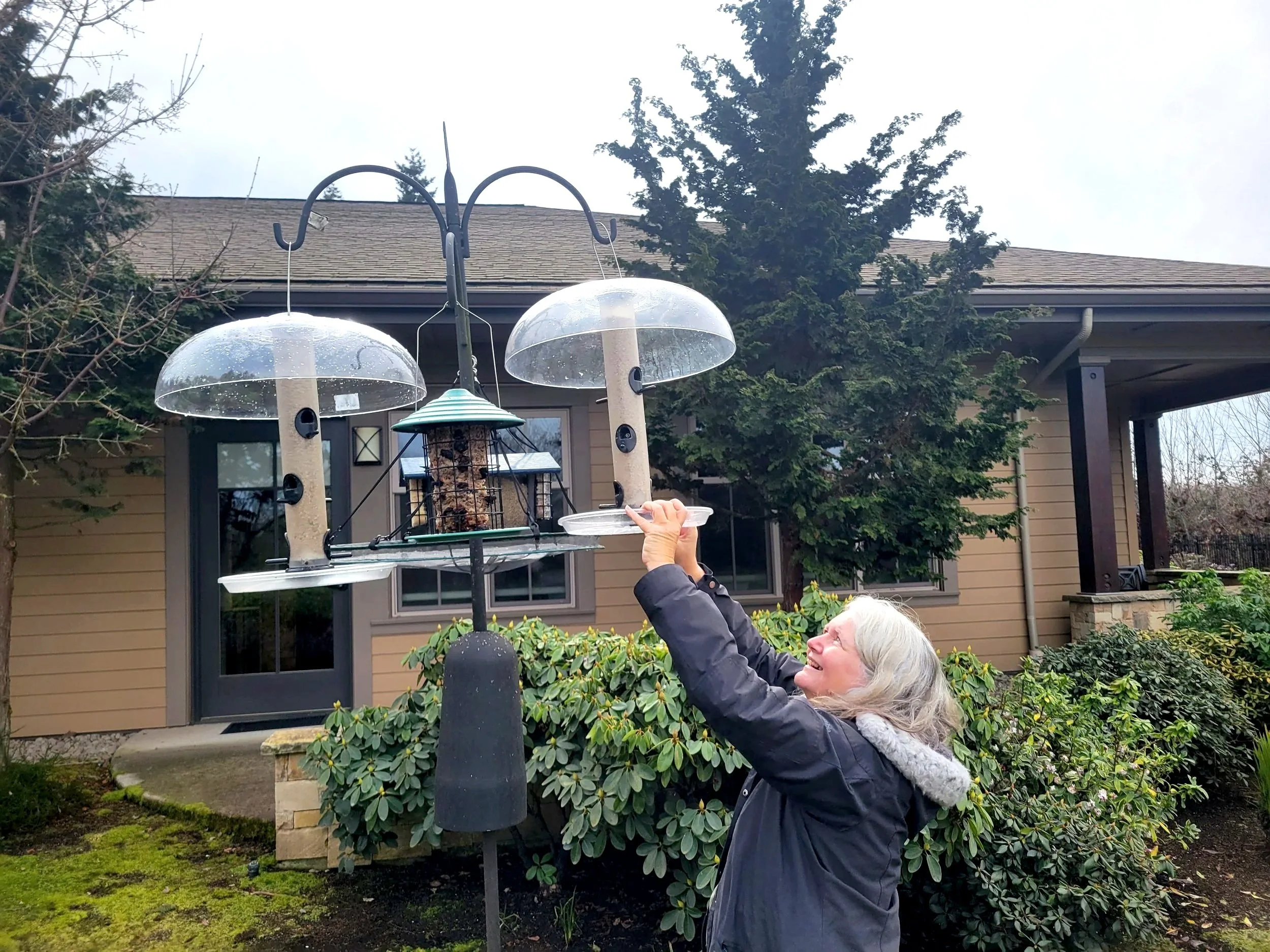 Knowing some of the feeders were beyond rescue, Holly called in the professionals at Wild Birds Unlimited, a bird-centric retailer with a Eugene location in the Delta Oaks Shopping Center. After hearing about the hospice house, operations manager Dara knew right away she wanted to help. Since then, Wild Birds Unlimited has donated thousands of dollars’ worth of feeders, seed, and supplies.